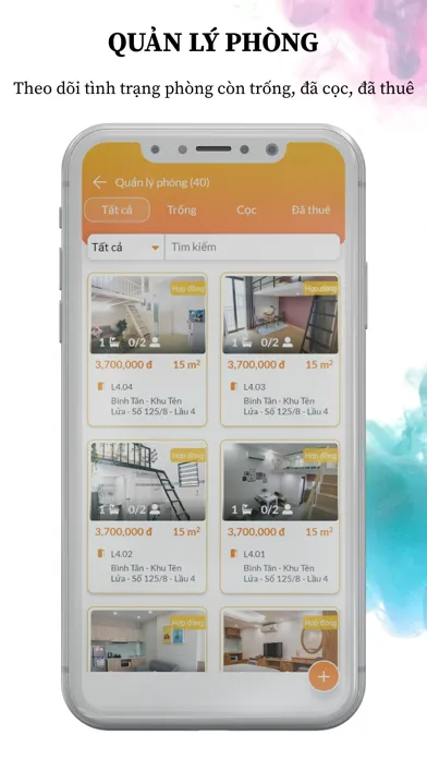 - Quản lý phòng: Theo dõi danh sách và tình trạng phòng còn trống, đã cọc, đã thuê; thêm, chỉnh sửa, xóa phòng