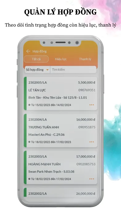 - Quản lý hợp đồng: Theo dõi danh sách và tình trạng hợp đồng còn hiệu lực, thanh lý; thêm, chỉnh sửa, gia hạn, thanh lý, xóa hợp đồng