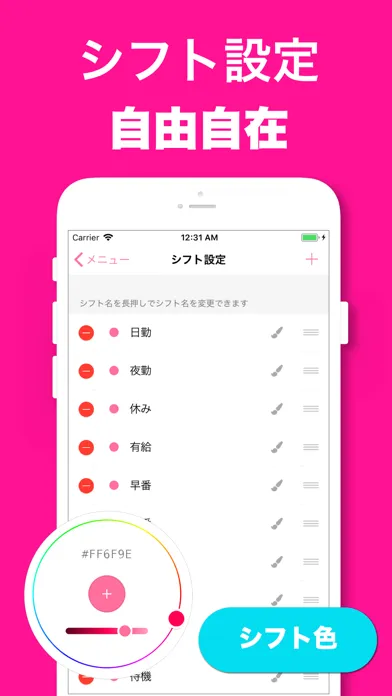 設定画面からシフトの名前、色、並び順をカスタマイズできます。自分好み、自分に合うように自由にカスタマイズしてください
