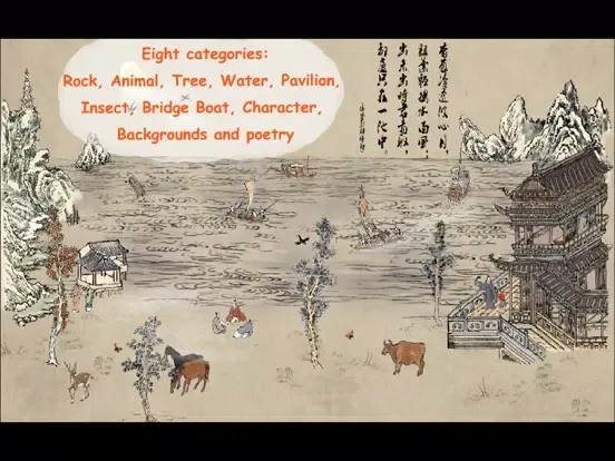Unlock and use 400 and more elements to create your own ink painting works.Elements are classified into eight kinds :"Rock, Animal, Tree, Water, Pavilion, Insect, Bridge Boat, Character, Backgrounds and poetry".