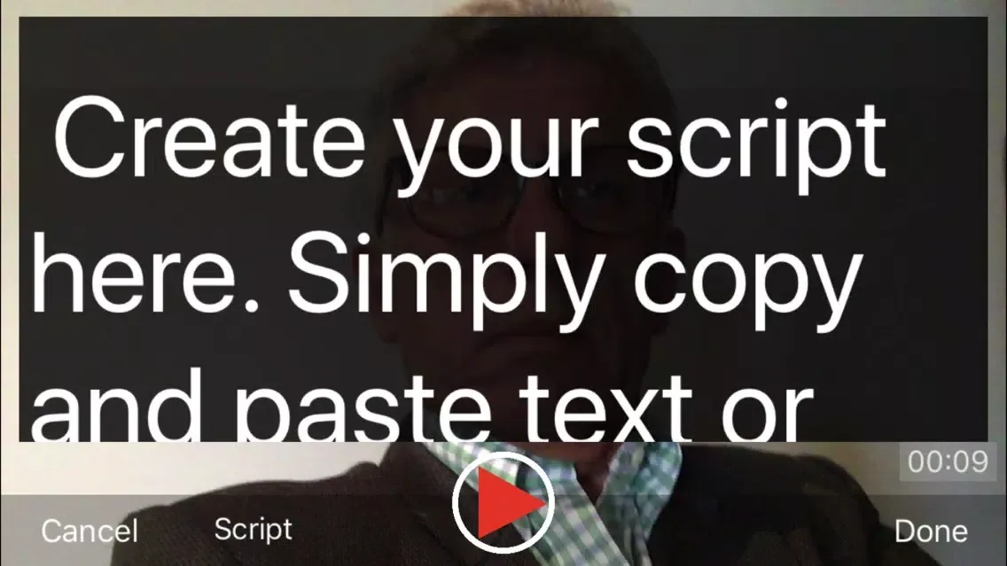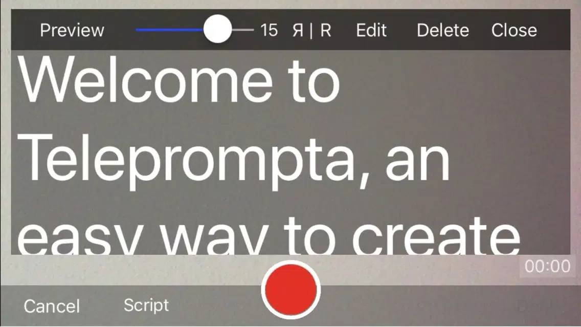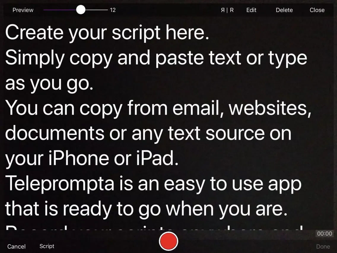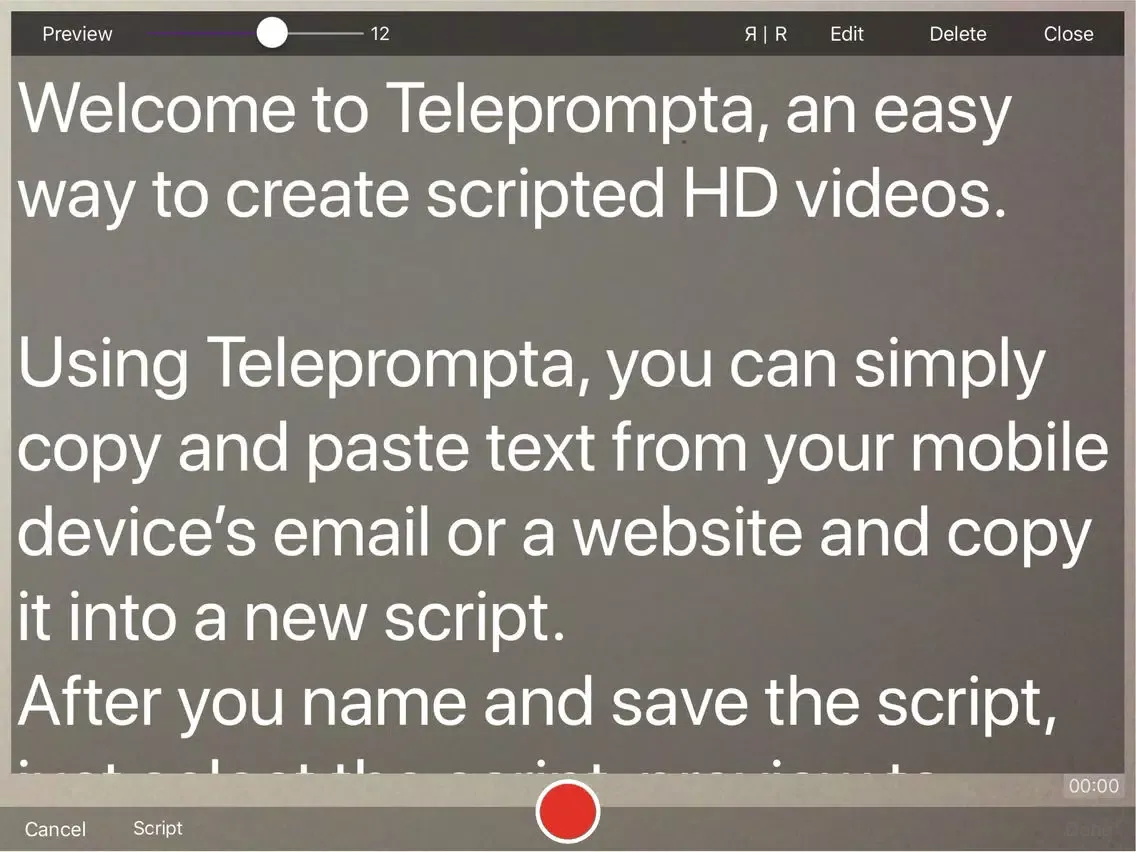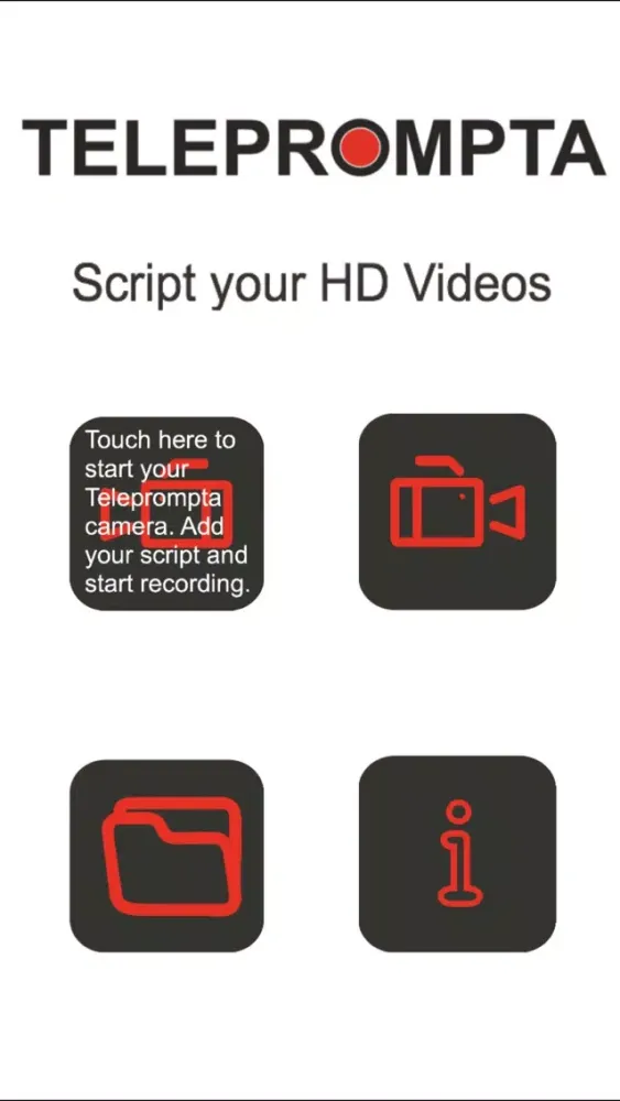 Press 'Script' on the screen and Teleprompta comes alive. We've included a Welcome script so you can practice reading from your mobile device.