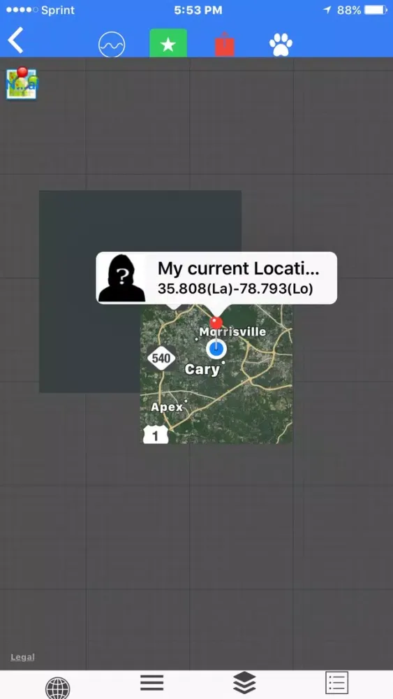 In case get lost, you can plot your locations' latitude, longitude and notify people who are trying to locate you (you must first grand app access to your location by clicking the green star on the main map page)