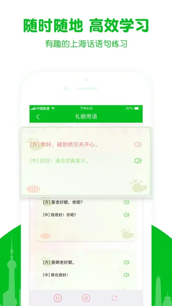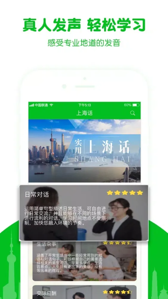 + 采用双语对照标注的形式展示内容,配有真人发音,能够准确、高效、便捷地学习地道的上海话表达