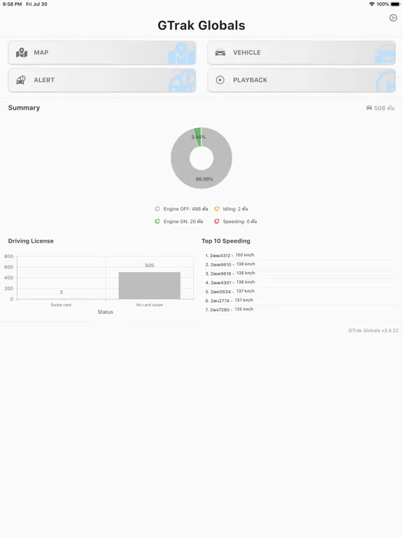 โปรแกรมสำหรับติดตามยานพาหนะ โดยแสดง ตำแหน่ง สถานะ เวลา และรายอะเอียดต่างๆของยานพาหนะ โดยจะมีหน้าเมนูใช้งานดังนี้
