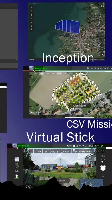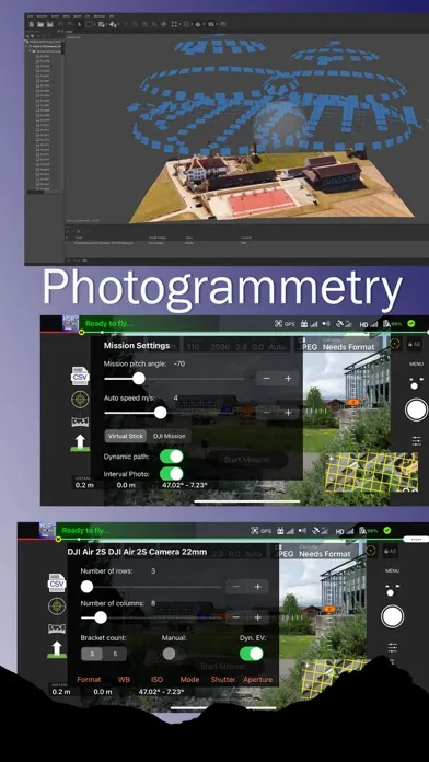2D flat, vertical and 3D semi spherical photogrammetry missions. Virtual Stick and Mutable Mission support. The speed is automatized for JPG and RAW images. CSV mission import from the map-creator APP (iOS and Mac OS)