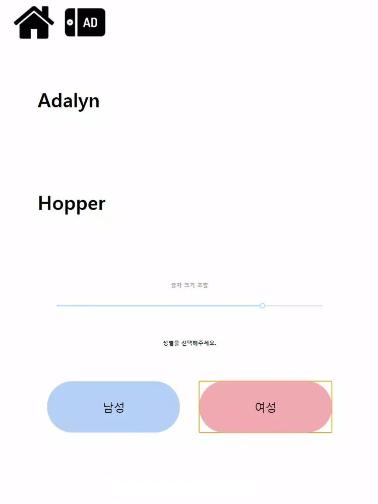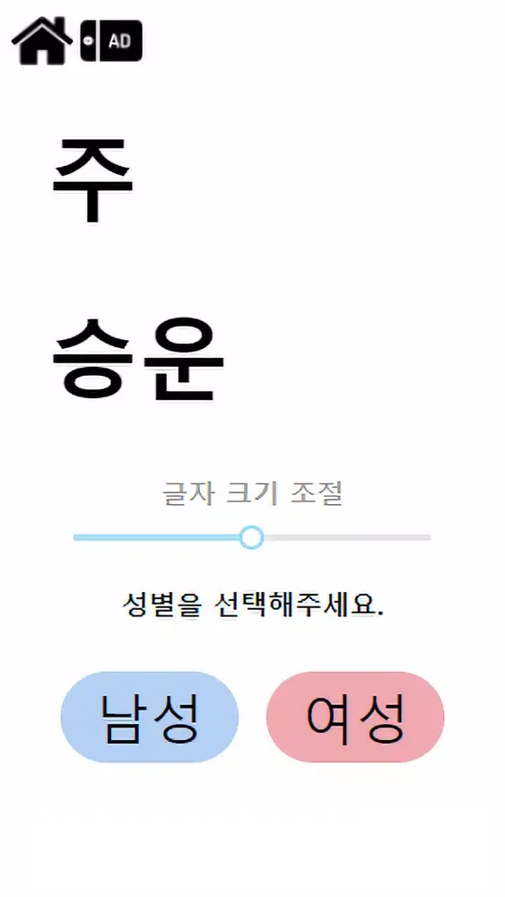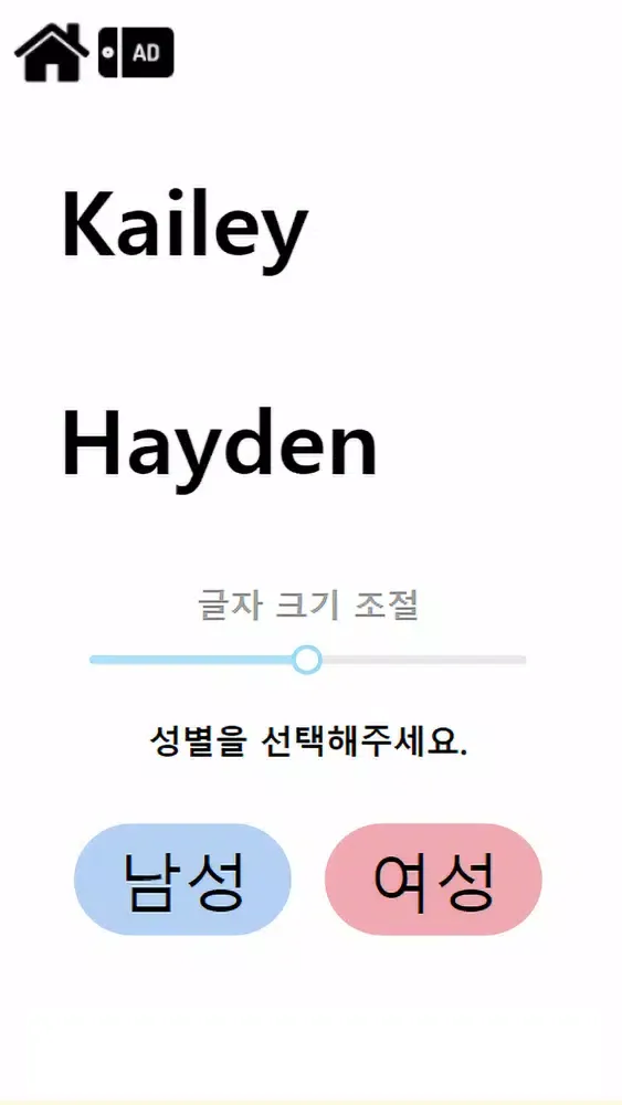 - 남성, 여성으로 이름이 구분되어있습니다. 원하는 성별의 이름을 생성해보세요.