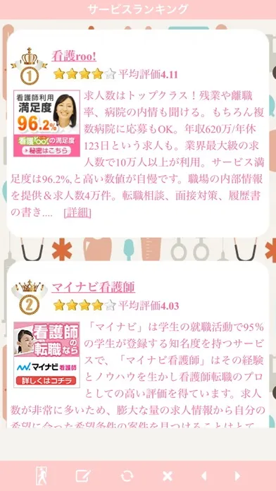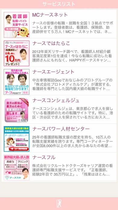 看護師の方に朗報です!給料や待遇面を改善したい方、勤務先の人間関係にお悩みの方、 キャリアアップを目指したい方など、理想の職場を模索している方への指針となるアプリが誕生しました!就職・転職の支援サービスも沢山あるので、どれが自分に最適なサービスか決めるだけでも大変です。そんな時にはこの「看護師求人ナビ」!実際にサービスを利用されたみなさんの評価投票でランキングを作っていく新しいアプリです。その他、厳選した支援サービスの掲載や看護師関係の最新ニュース配信など、きっとあなたのお役に立ちます。より良い明日のために、迷ったらまずこのアプリをダウンロード!
