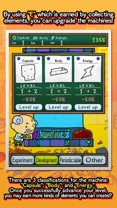 By using "E" which is earned by collecting elements, you can upgrade the machines!