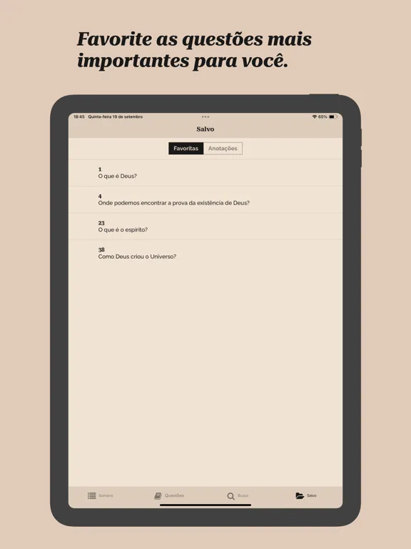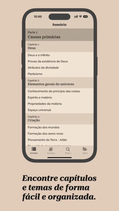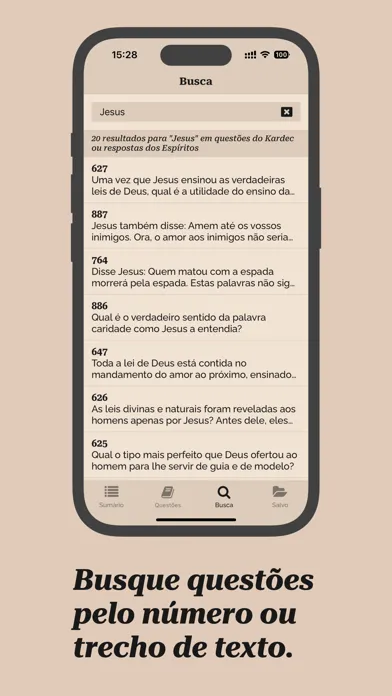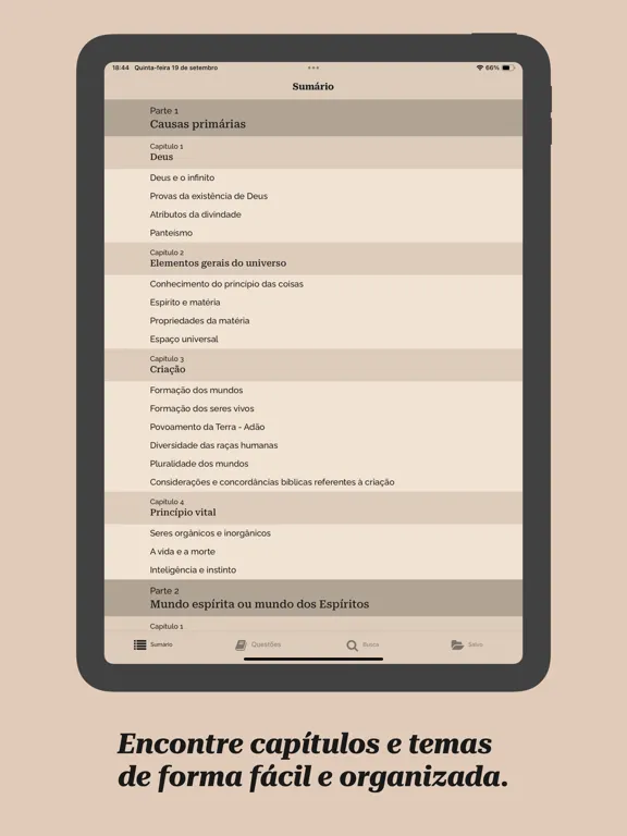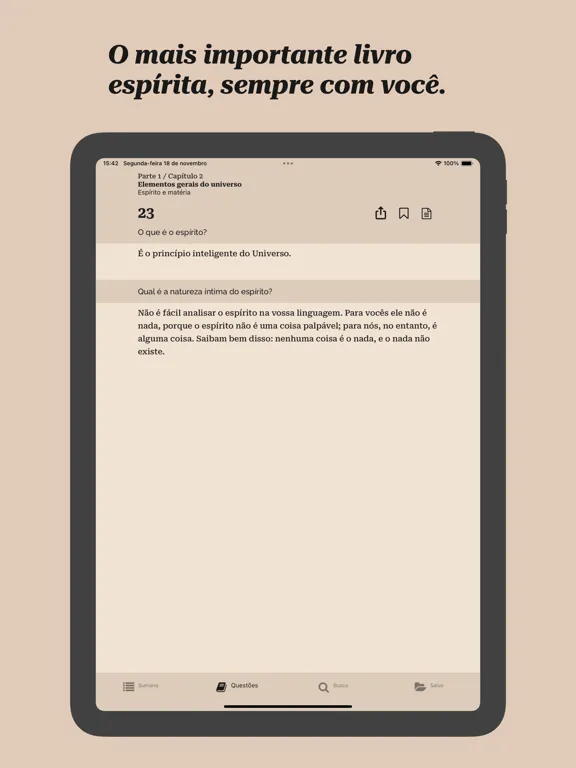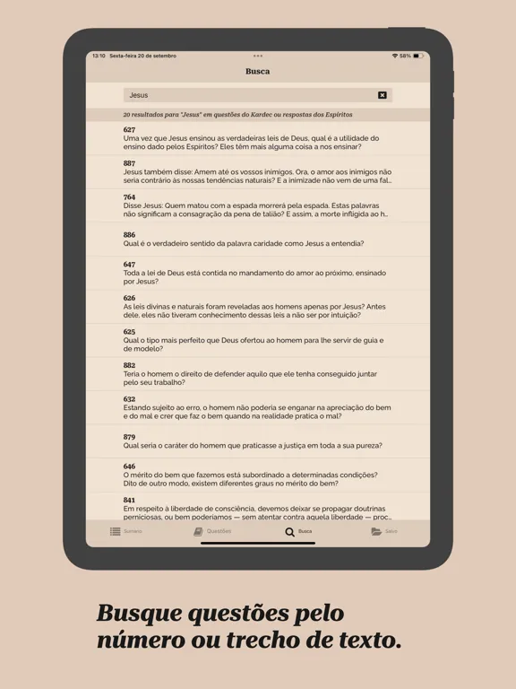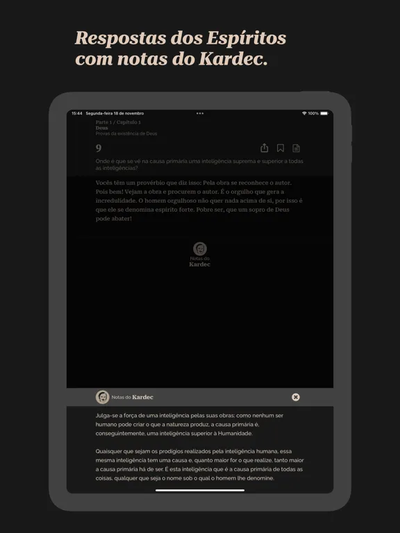 - Navegação intuitiva entre as questões, respostas dos Espíritos e notas do Kardec
