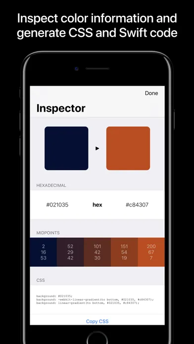 Tap the Inspector button in the bottom toolbar to see detailed color information (such as RGB, HSB and hexadecimal values), and to generate CSS and Swift code. Copy it with a tap of a button - designing your next website or groundbreaking app couldn't be easier.