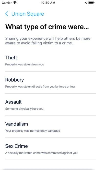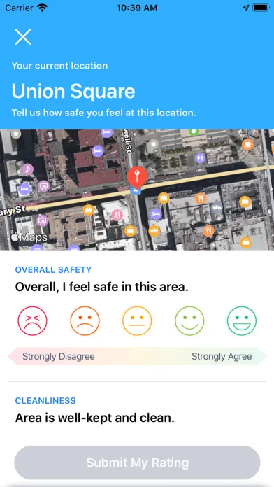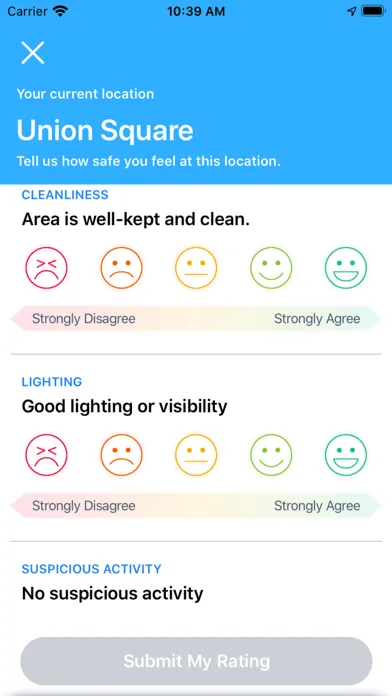 • Users can provide safety ratings to share their safe experience, dangerous experience or even if they were the unfortunate victim of a crime.