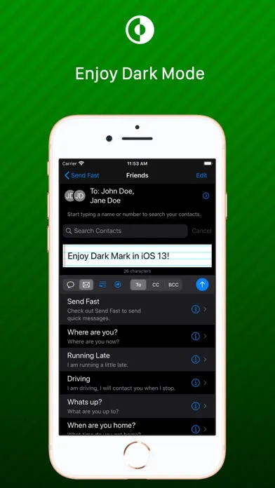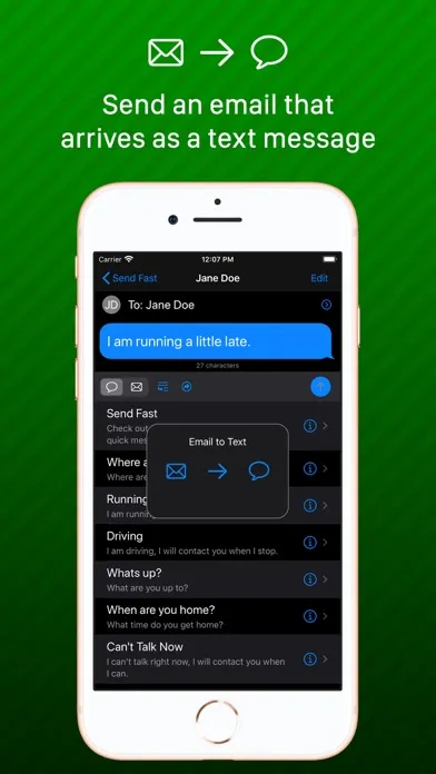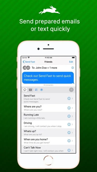 Send Fast is an easy to use text message and email composing assistant designed to make you more efficient in your messaging. Load pre-made phrases into a text message or email with one tap. Designed to behave similar to the built-in messaging systems to be easy to use. You can also send emails that will arrive as text messages!