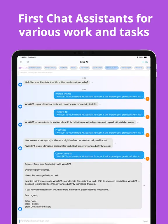 In addition, we are excited to introduce the first AI chat featuring over 80 deeply integrated assistant actions, allowing you to seamlessly perform tasks through intuitive chat interactions. Whether you need to draft an email or post, refine content, respond, or adjust the content tone, simply message WorkGPT the text, and it will handle the rest.