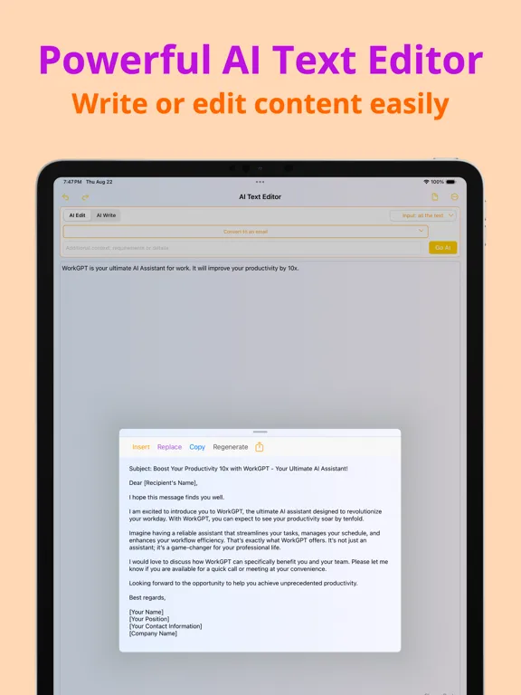 Plus, our innovative and powerful AI text editor enables you to compose and draft any text conveniently and quickly.