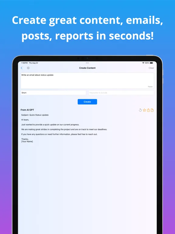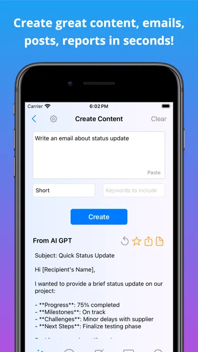 • Convert text into various content types, such as emails, social media posts, reports, status updates, notes, descriptions, tweets, and more!