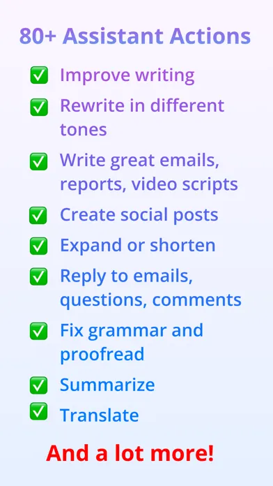 WorkGPT AI offers a comprehensive suite of powerful tools to help you write and read, deliver great work and handle various of daily tasks effortlessly with high productivity, e.g. creating material (posts, notes, reports), editing texts, writing emails and replies, understanding content, converting content, translating, creating images etc. It can also help you improve and manage content easily with one click, e.g. rewrite in different tones, improve writing and proofread, fix grammar and spelling, paraphrase to ensure clarity and coherence, and many more!