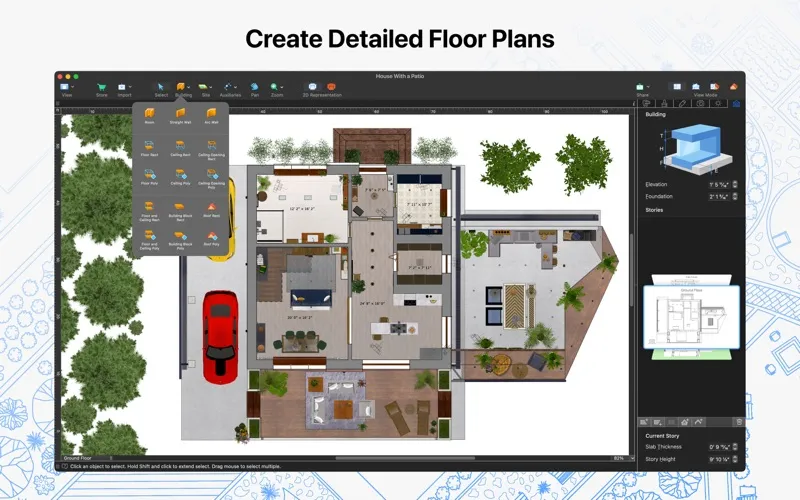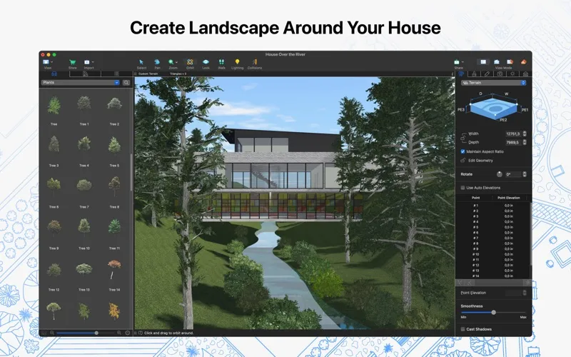 • Terrain editing tools for landscape design: create elaborate terrain with elevation lines and pits, lay driveways and plan out your garden or backyard.