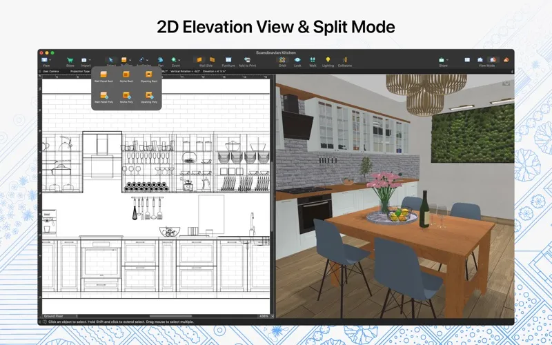 • 2D Elevation view that displays the side view on walls and roof; a perfect tool for working with openings, niches and wall panels.