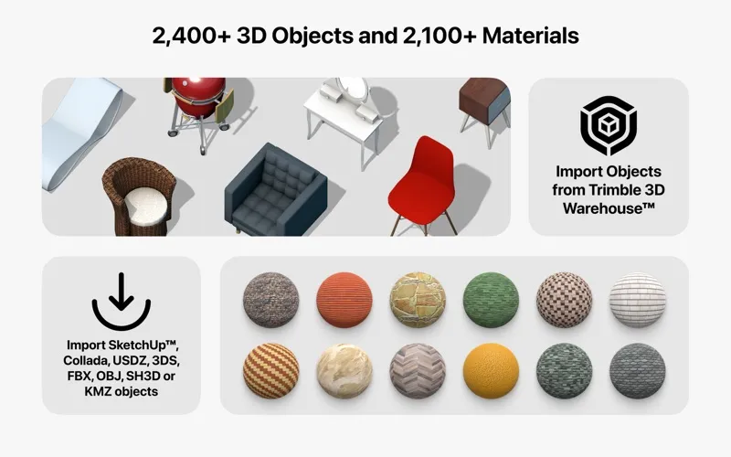 • Add and move furniture and other objects (2,400+ items), and apply physically based materials (2,100+ supplied materials). Thousands of free models can be imported from the Trimble 3D Warehouse.