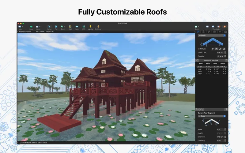 • Custom-shaped roofs: freely edit roof segments to roofs of any form and complexity.