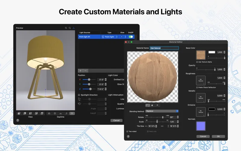 • Material Editor that allows you to create sophisticated custom materials, controlling their texture and light emissive properties.