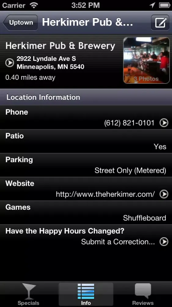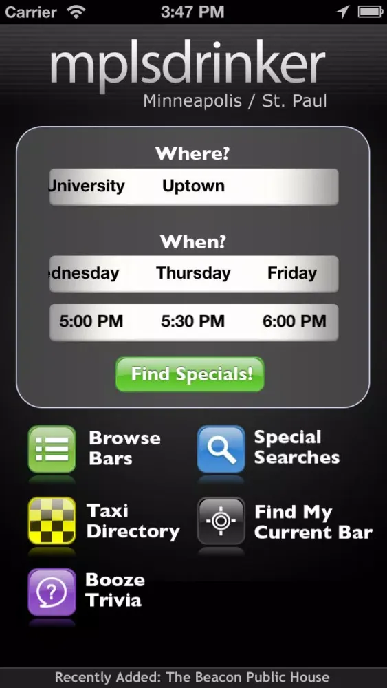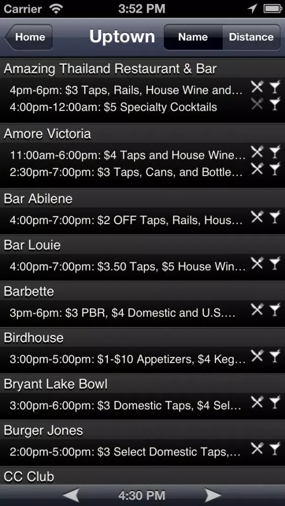 Search by time, or just browse all the bars happy hours. Turn your device to the left and see a the Happy Hour Map. There's even a directory of taxi numbers included for you. You can also see information about the bars and restaurants like their phone number, website, what games they have (Pool, Darts, Golden Tee, etc) and more.