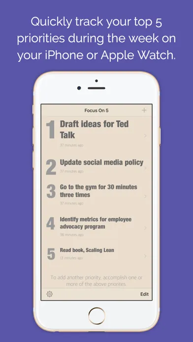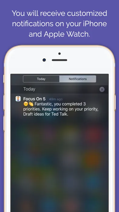 Each week, Focus On 5 will ask you to reflect on what matters to you and to define 5 priorities to accomplish for the week. During the week, Focus On 5 will gently remind you of your priorities, and then you can review and accomplish them on your iPhone and Apple Watch.