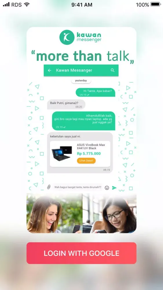 Kawan Messenger bukan hanya aplikasi chatting antar sesama pengguna lainnya. Tetapi juga punya misi untuk membuat penggunanya saling membantu. Caranya dengan mendorong terciptanya lingkar ekonomi antar sesama pengguna.