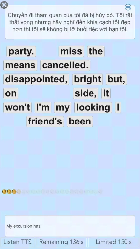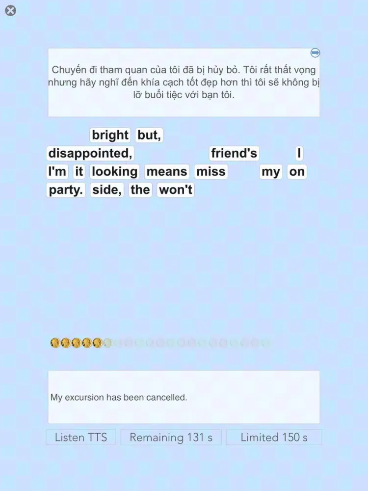 Bốn là, thực hành đặt câu tiếng Anh. Trong khi bạn chạm tay vào màn hình để sắp xếp đơn vị thành phần tiếng Anh đã được thực hành, bộ nhớ của bạn sẽ hấp thụ cấu trúc tiếng Anh và sẽ không mất đi. Mỗi đơn vị cấu trúc sẽ đưa ra từng ví dụ hầu như không bị lặp lại và những ví dụ ấy sẽ làm cho bạn nhận ra làm thế nào để đặt một câu tiếng Anh!