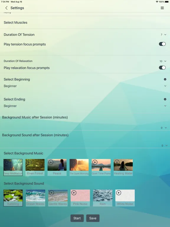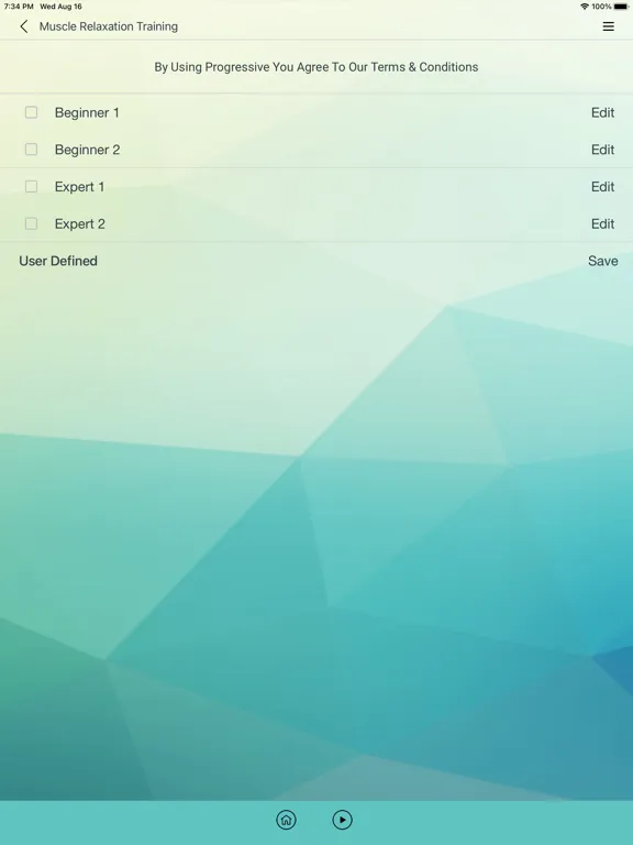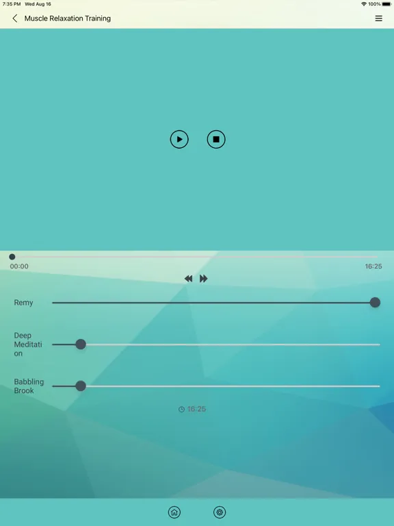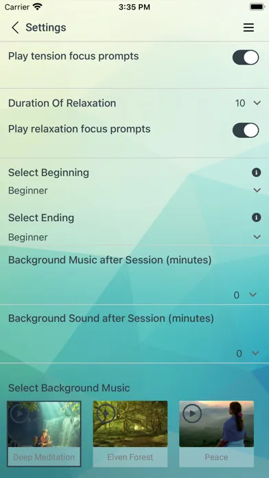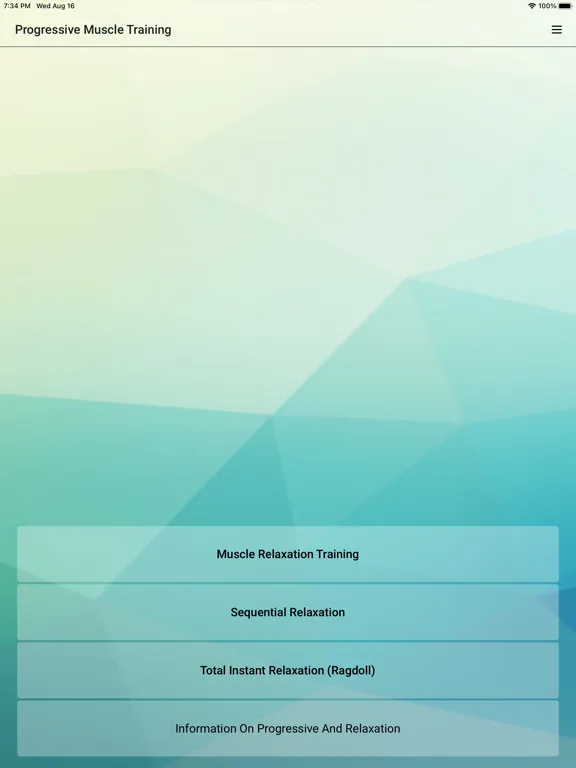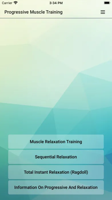 The app includes two sessions with variation in the muscles used. We suggest you alternate between these. You can select one of six music options to help you relax and one of six background noises. For a quick start to reduce your tension, we suggest you complete several sessions every day for two weeks. After 14-20 sessions, you can start Sequential Relaxation and Total Instant Relaxation (Ragdoll).