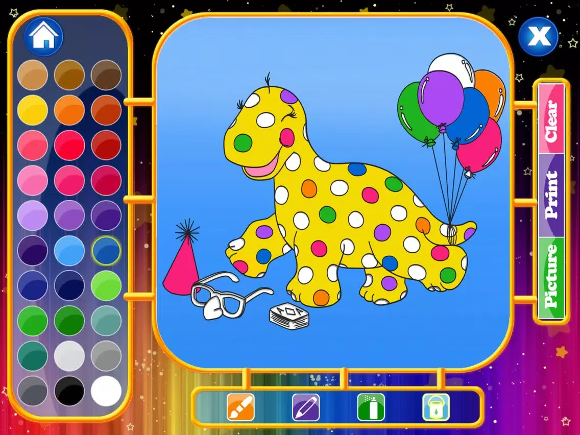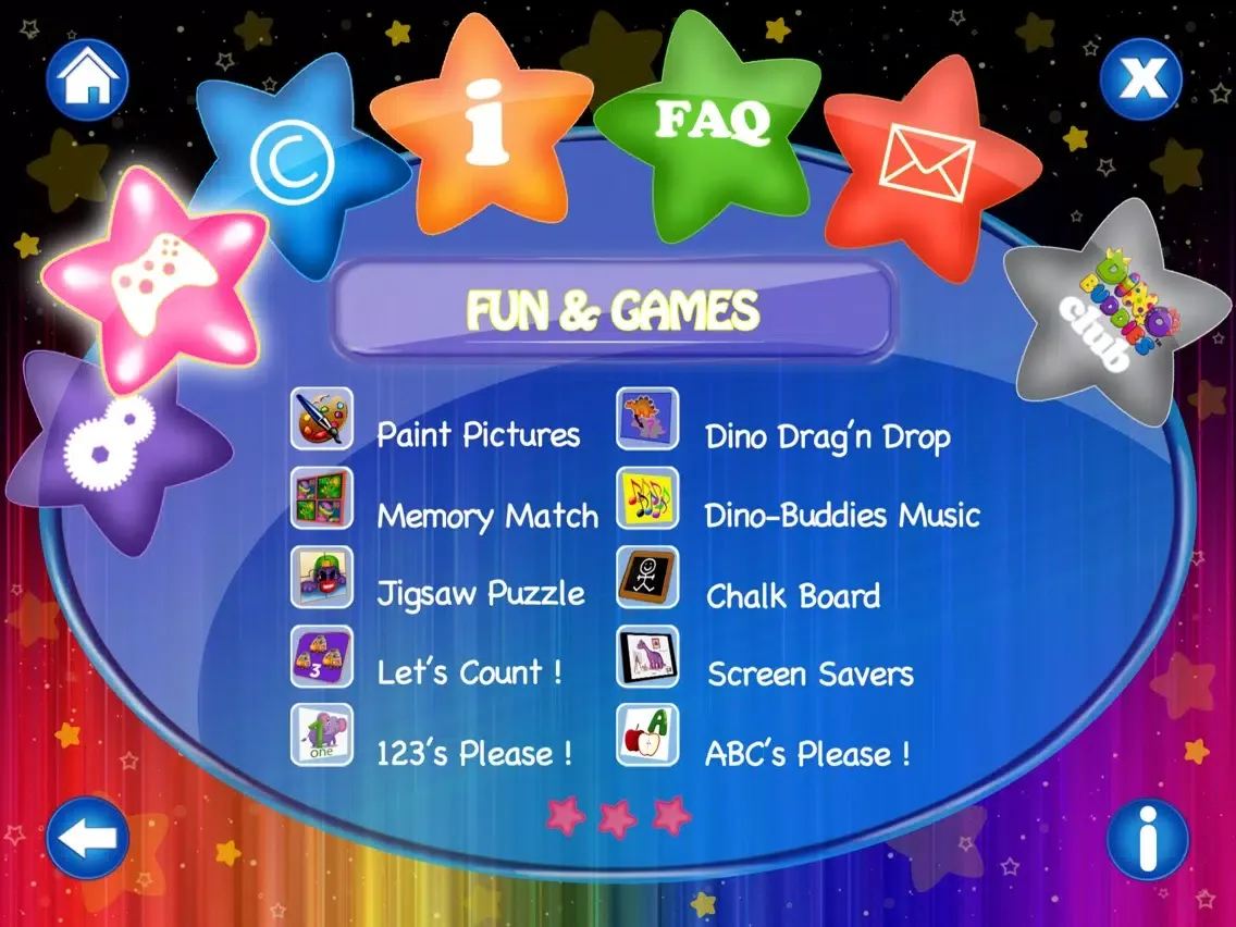 Paint-It (24 pictures), Memory Match (24 levels), Jigsaw Puzzle (12x3 levels), Let’s Count (10x1 level), 123’s Please! (10x5 levels), ABC’s Please! (26x6 levels), Dino Drag’n’Drop (10x1 level), DB Theme song, Chalk Board, Screen Savers (12), Dino-Buddies Club, Newsletter, The Dino-Buddies Story, and many, many more options