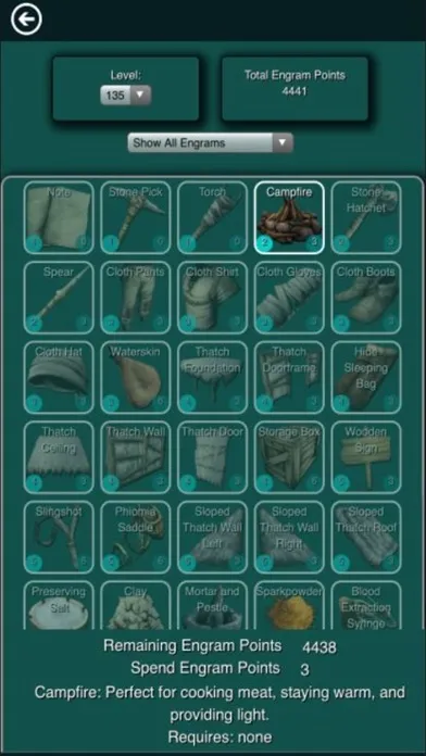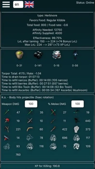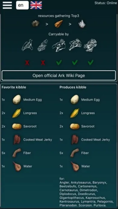 • Overviews for dinos and creatures: carryable by, can damage, trapped by, fits through, gathering efficiency, XP for crafting and farming, weight reduction for resources, dino base stats, explorer notes, buffs, biomes and a lot more