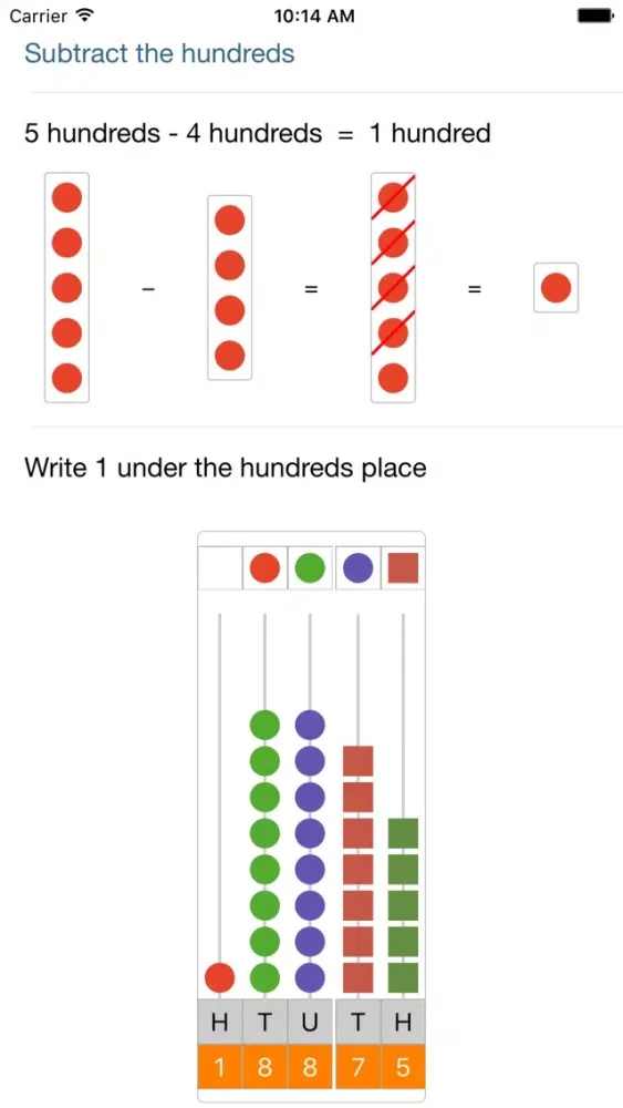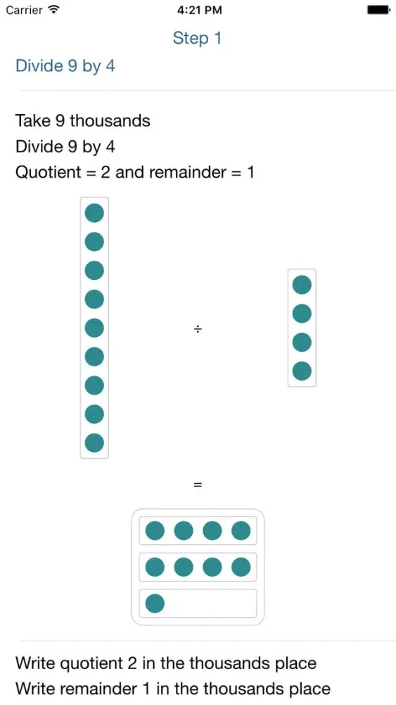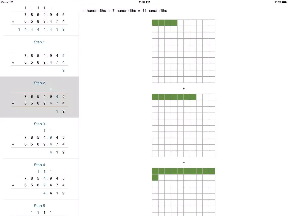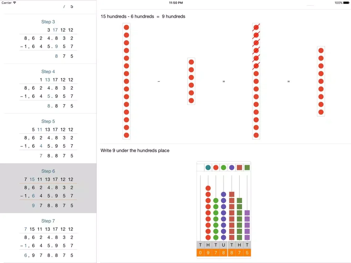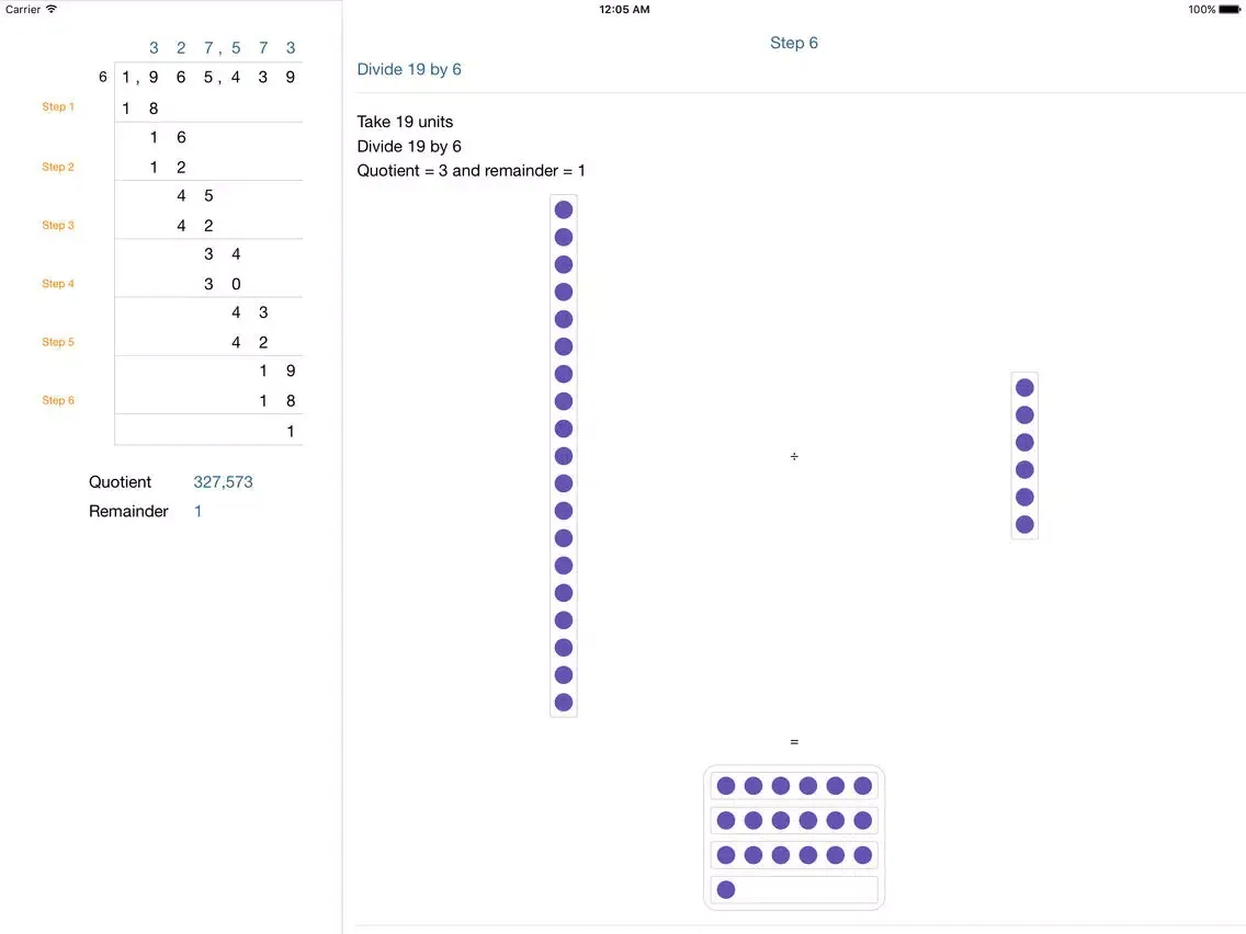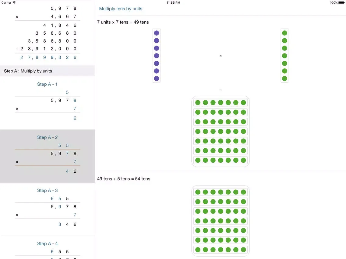 • Split View: split view screen for medium sized numbers with calculated step results for the arithmetic operation on the left side of the screen and pictorial explanation on the right for iPad, iPad Pro and iPhone 6 plus.