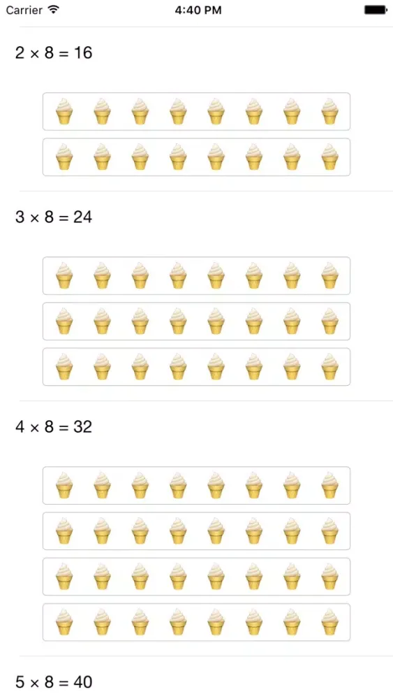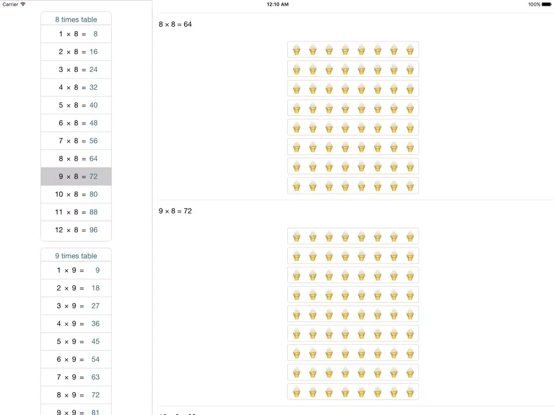 • Times table : Learn times table from 1 to 12 in pics of guitars, bicycles, football, lollipops etc., helps kids to easily remember times table in pics.