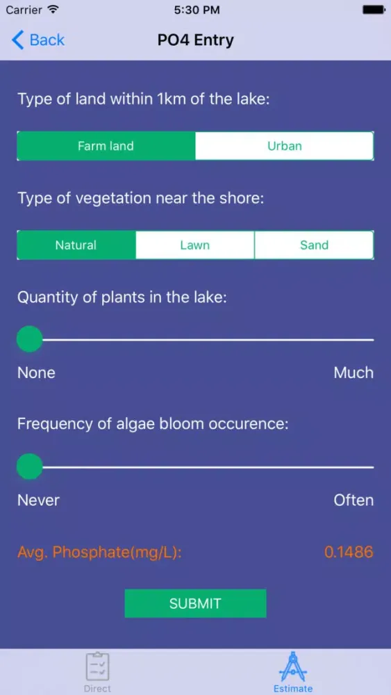 The Algae Estimator app allows anyone to enter simple measurements to determine the likelihood for an algal bloom or harmful algal bloom (toxic HAB from Cyanobacteria) occurring in shallow lake waters. The user can enter direct values for algae concentrations for either total or cyanobacterial Chlorophyll a values, or - if those are not available - from the easy to measure Secci Depth and dissolved Oxygen data as well as Temperature and Phosphate values of the lake. Hints on how these measurements can be done in an easy manner are provided within the App. A weather forecast option and GPS data for measurement sites are provided as well. Data can be stored and reviewed in the app for later use and evaluation. The app uses the user-entered measurements to predict whether or not there will be an algae bloom in the body of water and if so, how many hours it will be until the algae reaches a harmful level. Harmful algae blooms can cause bodies of water to be unusable for recreation and drinking, so predicting harmful algae blooms is useful in order to take precautionary measures.