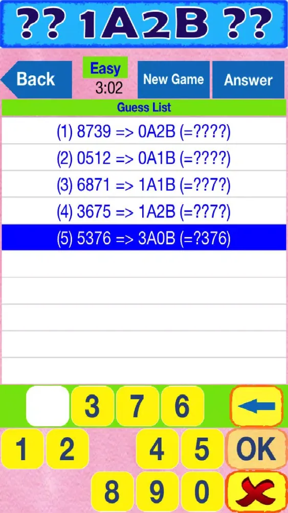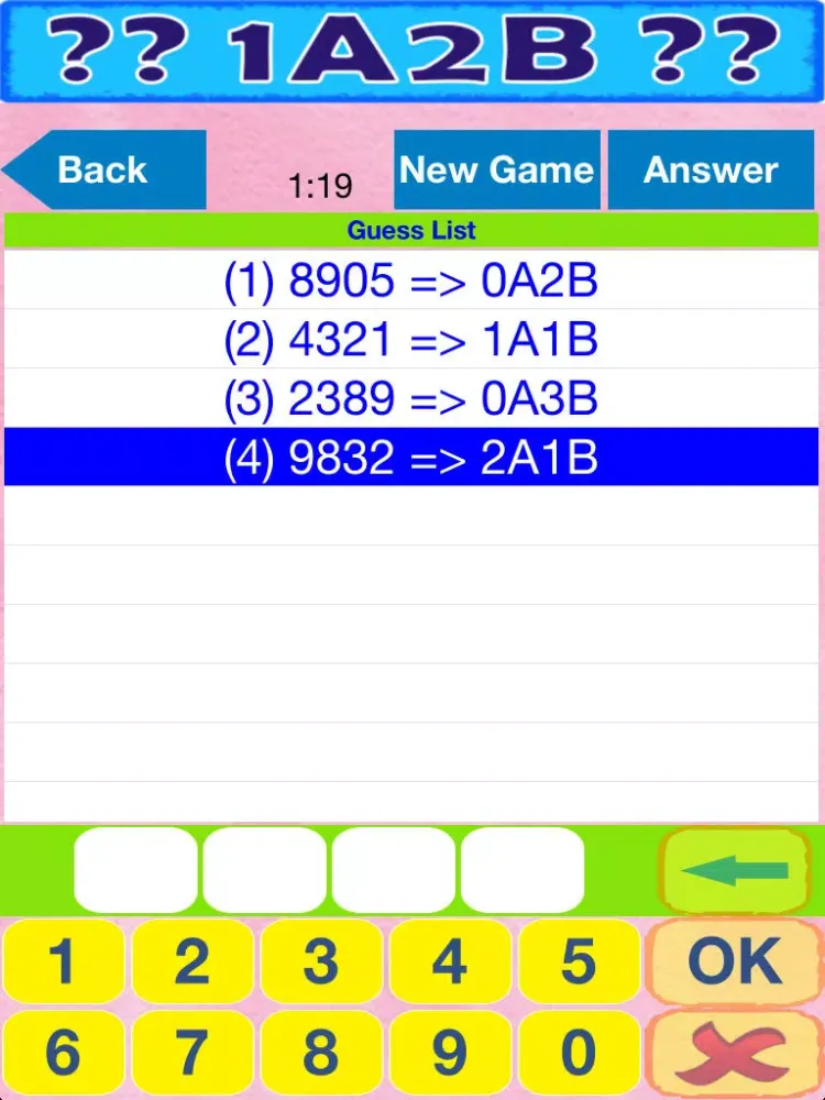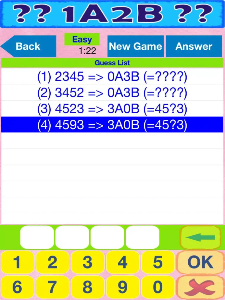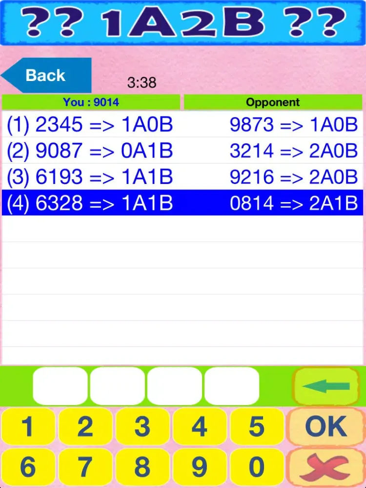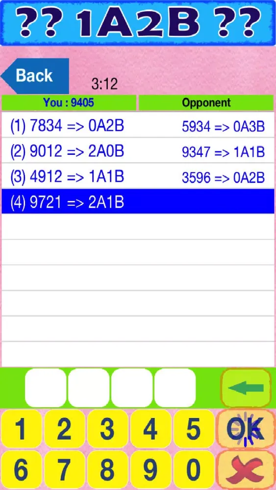 The player judges the possible result though hinted code (A: number is right and position is matched, B: number is right but position is unmatched).