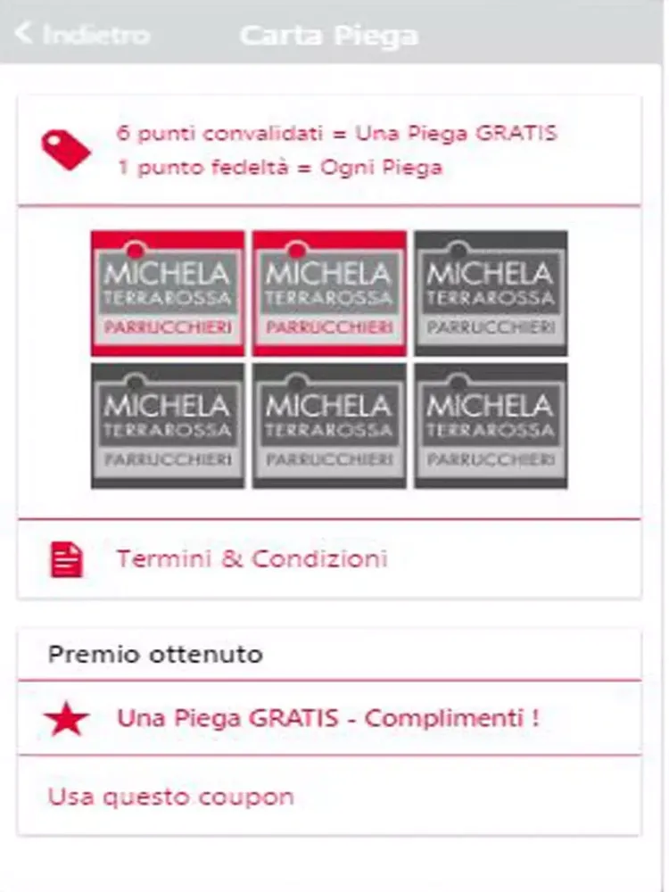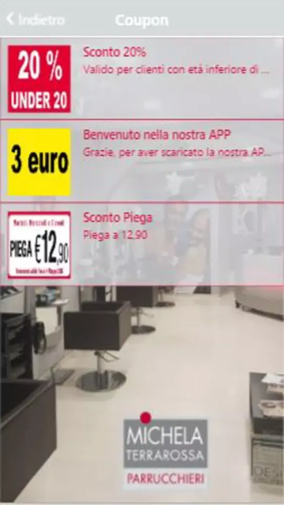 Con la nuova APP Michela Terrarossa Parrucchieri, sarai in costante aggiornamento con le promozioni del salone, potrai prenotare comodamente dal tuo cellulare, accumulare punti nelle carte fedeltà e tanto altro ancora. Scaricala subito e otterrai uno sconto immediato alla cassa!