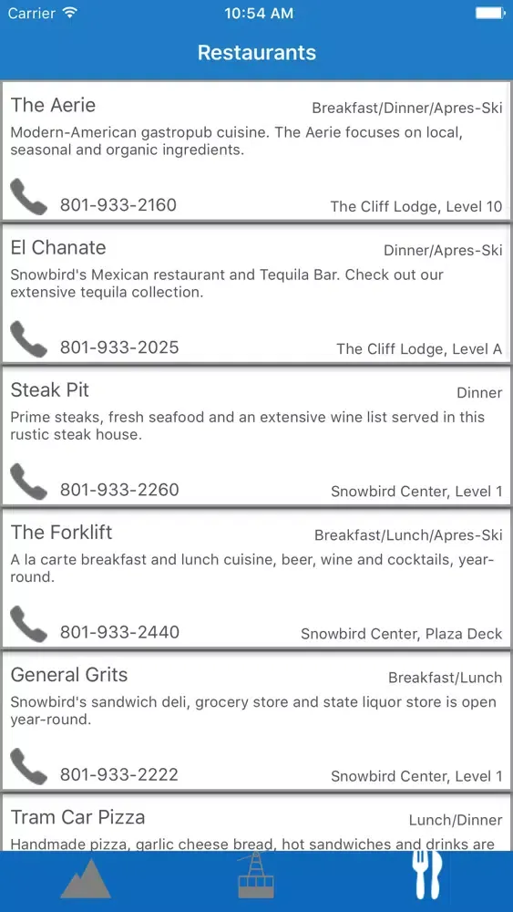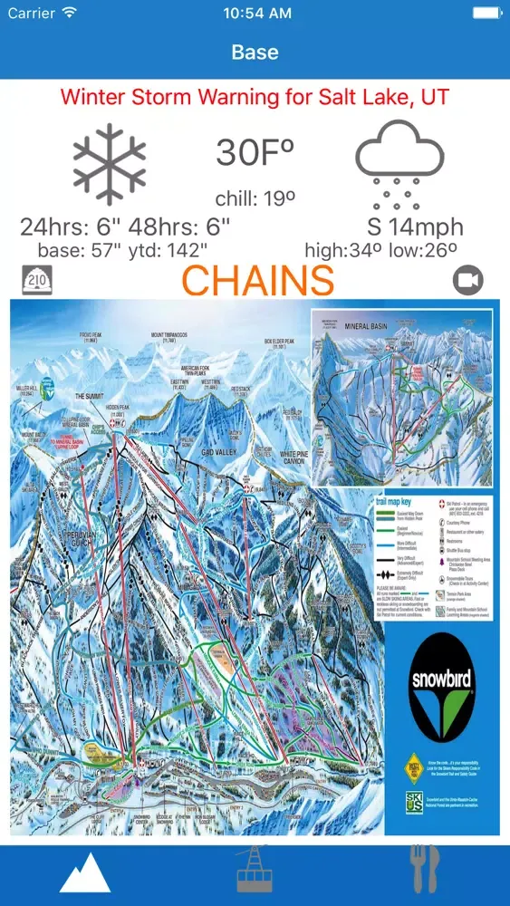 The Snowbird Helper App is designed to bring a collection of information to help enjoy your day at the mountain. It includes an offline trail map, a weather report with alerts, snow data for the mountain, canyon road status, expandable map, lift status and trails commonly associated with the lift, and a list of food options, including the contact information.