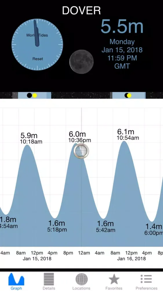 Moon Phase, Sunrise, Sunset, built-in offline map, GPS location detection, favorite locations, feet/meter support, 24 hour mode, and manual time adjustments.