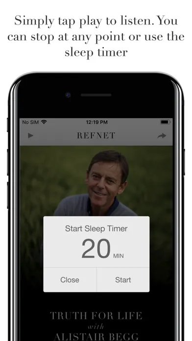 To begin listening to RefNet, open the app and press the play button in the top left of the screen. To finish listening to RefNet, press stop or use the sleep timer function.