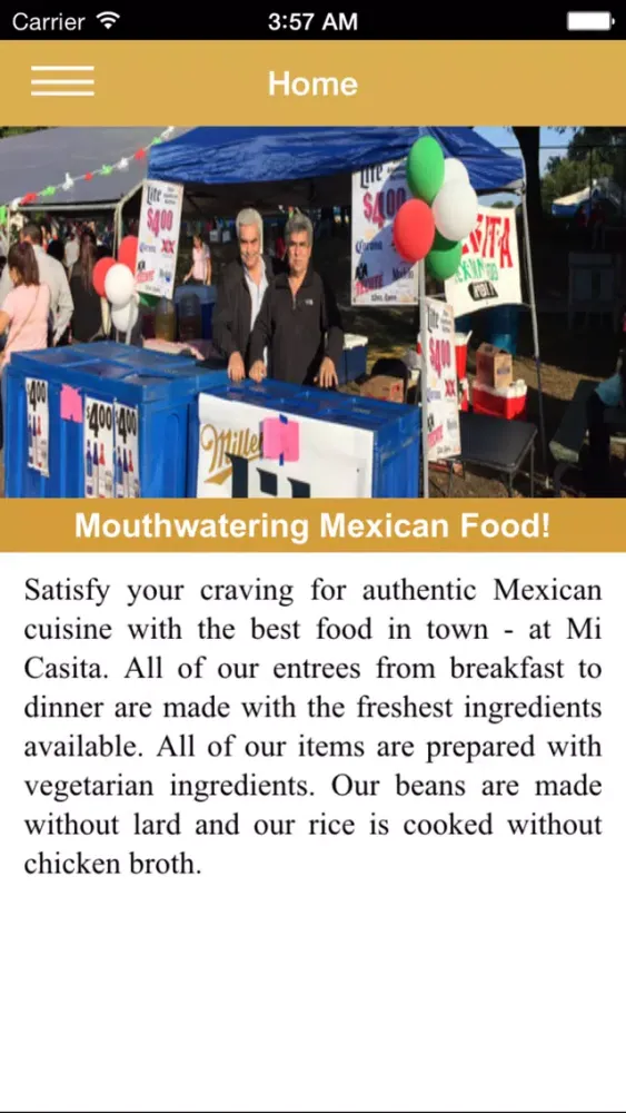 Satisfy your craving for authentic Mexican cuisine with the best food in town - at Mi Casita. All of our entrees from breakfast to dinner are made with the freshest ingredients available. All of our items are prepared with vegetarian ingredients. Our beans are made without lard and our rice is cooked without chicken broth.