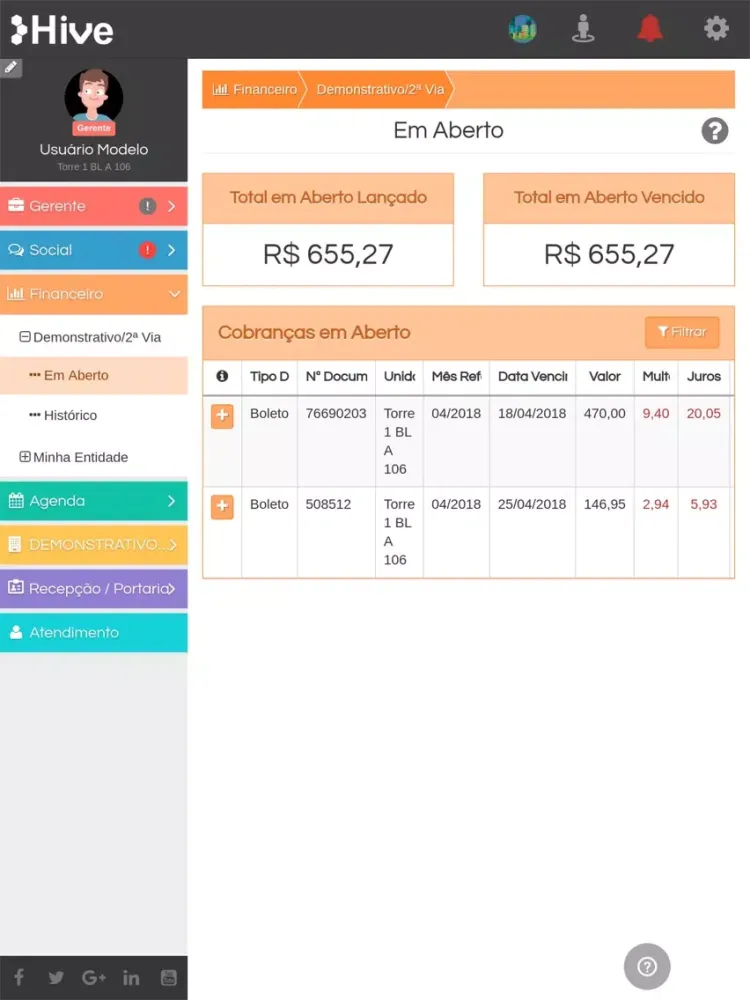 - Cobranças (em aberto e histórico).