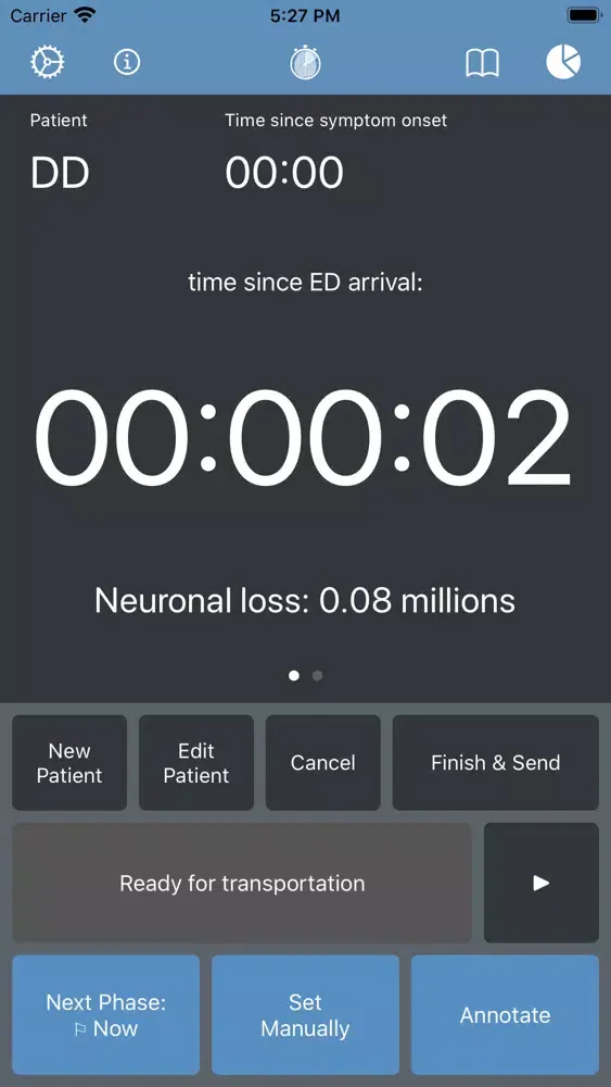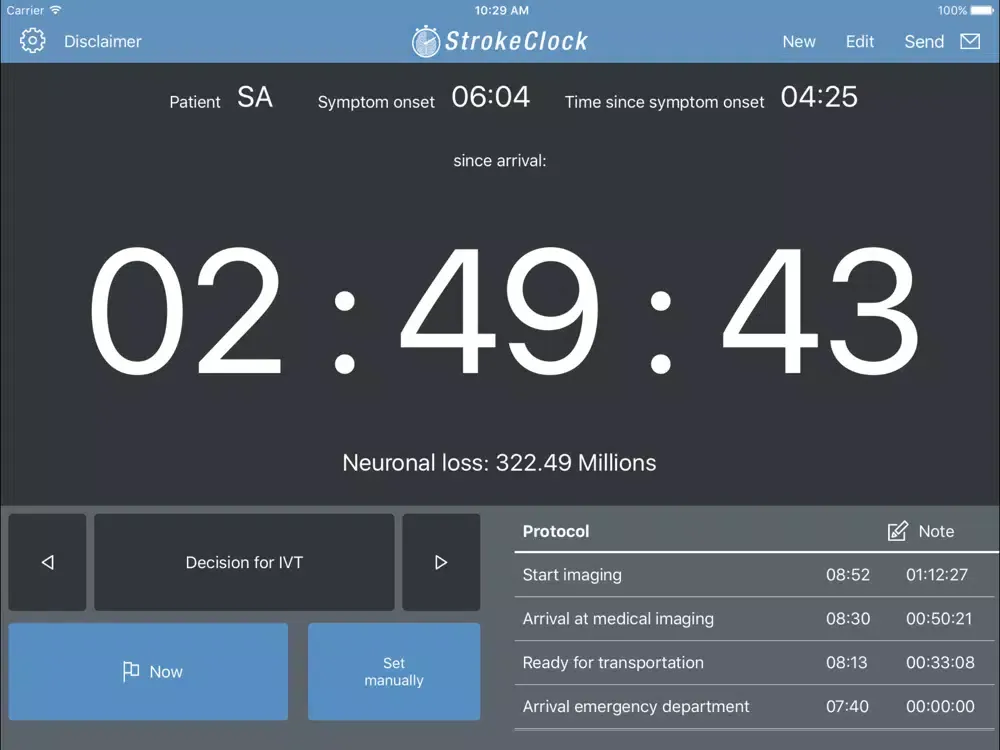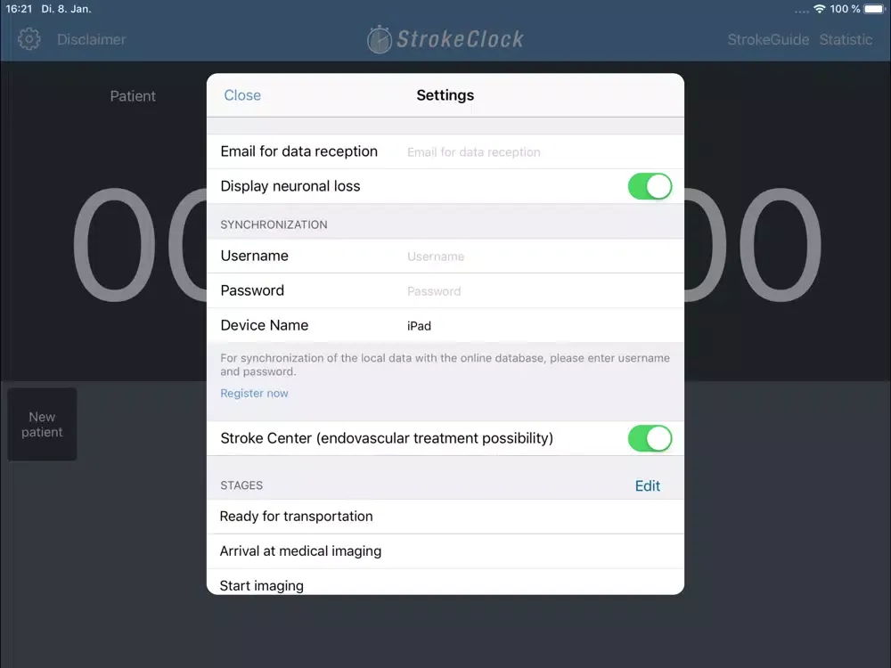 The StrokeClock App offered by the StrokeCenter Bern, Switzerland, allows continuous monitoring of the stroke treatment workflow in Stroke Centers and Stroke Units. The time points measured (i.e. hospital arrival, start IVT) are adjustable which allows perfect adaption to local needs.