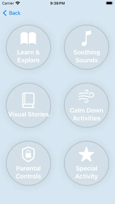 • Adults Section: Experience tranquility with serene visuals and sounds. Watch a peaceful rainfall video, listen to soft melodies, or follow along with a calming narration. The adults' section is crafted to provide a restful escape from overstimulation.