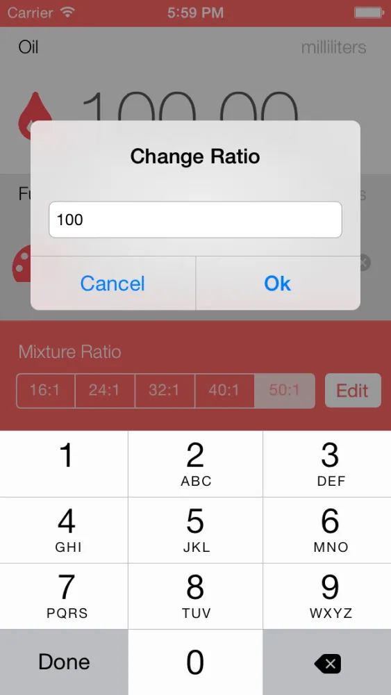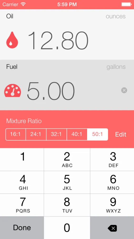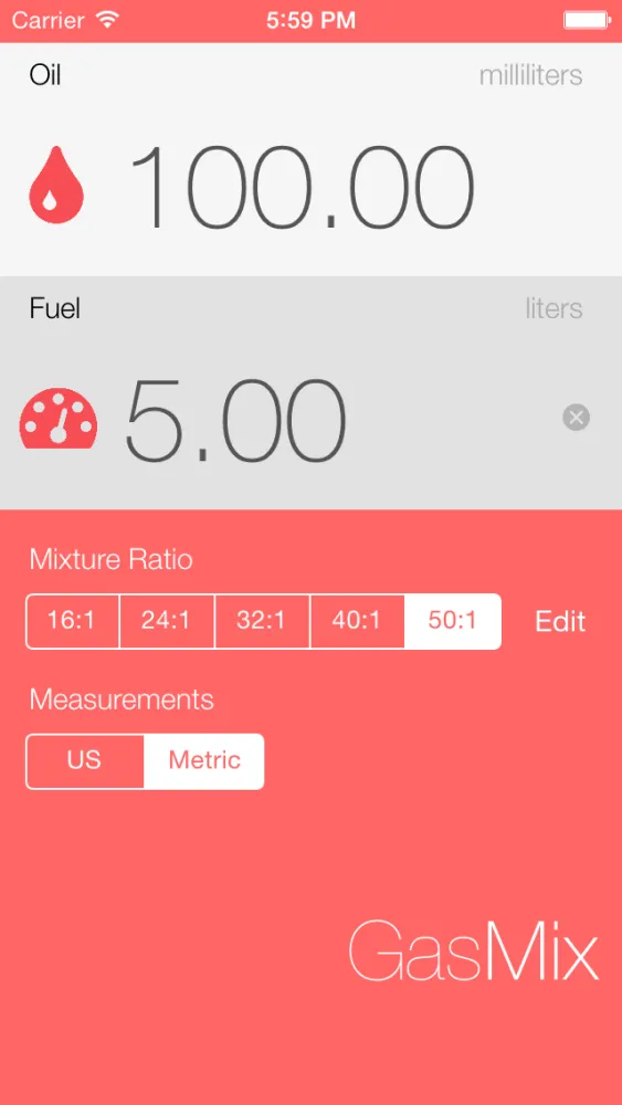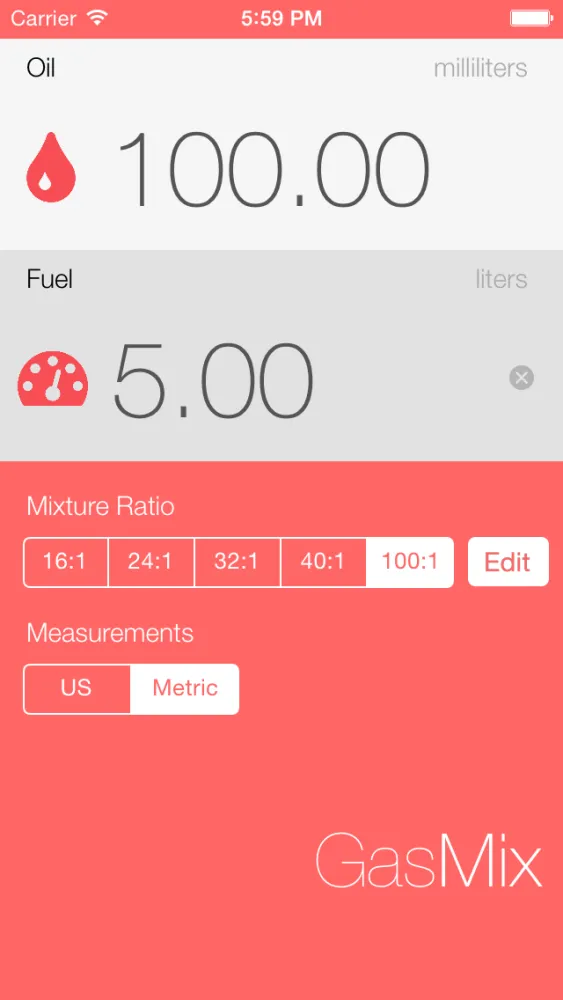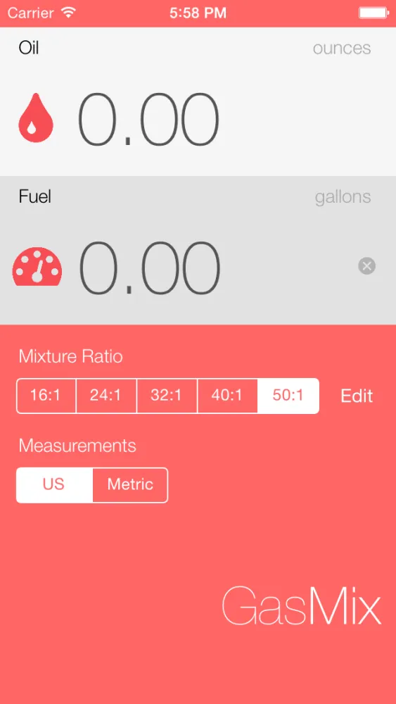 GasMix tells you how much oil to add to your fuel for use in two-stroke engines. Ratios are customizable, and you can pick between US or Metric units.