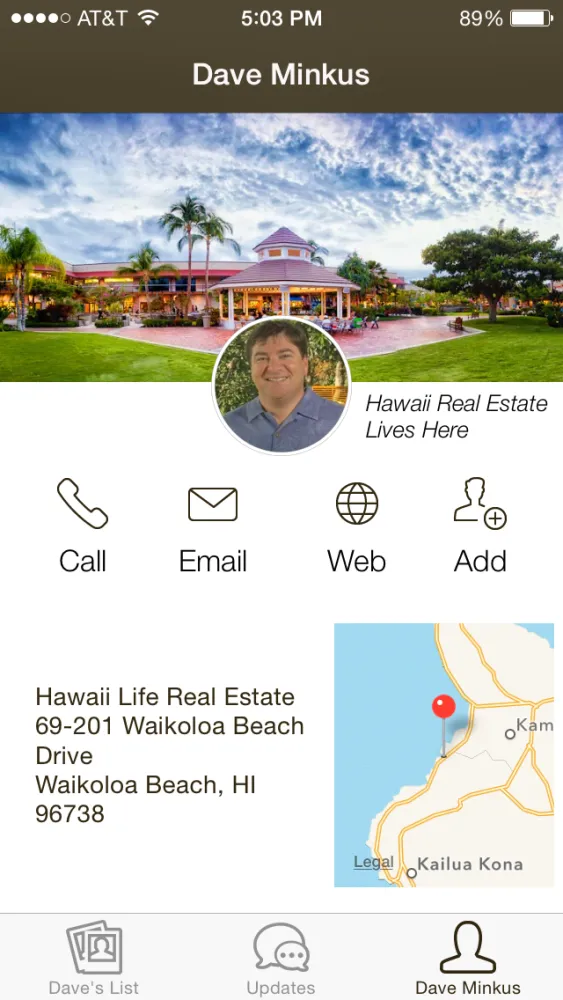 The Dave Minkus Hawaii Real Estate Directory app empowers his real estate business with a simple-to-use mobile solution allowing clients to access his preferred network of vendors, send dropbox links, and stay up to date with the latest real estate updates.