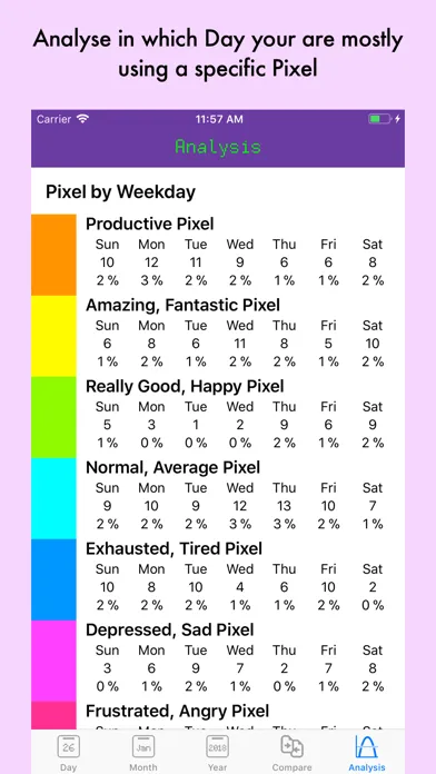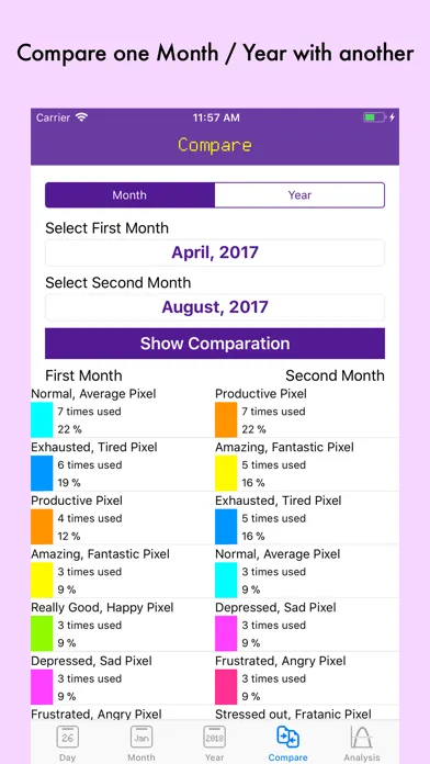 See your overviews in a monthly and yearly base. Compare a time period with another to see if you are changing your moods and finally review, what weekday is the one that is mostly effected by a specific mood.