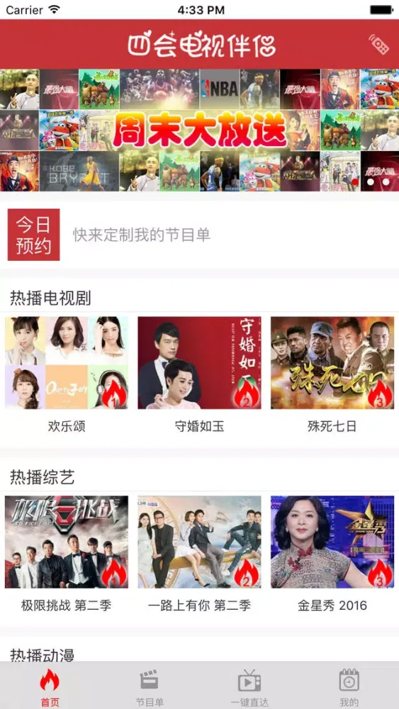 【首页】 最火活动,本周热播节目推荐,今日预约提醒。
