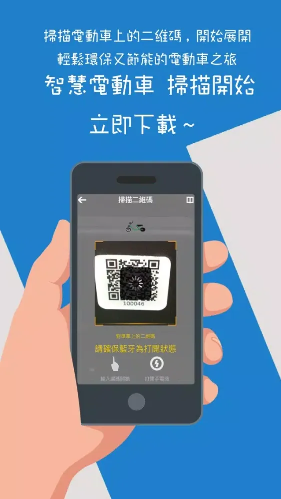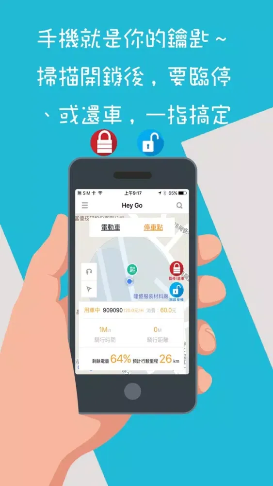只要下載APP,在地圖上搜尋離您最近的E-Bike,可立即預約或直接前往租車騎乘。掃描充車輛上的二維碼(QR Code),即可啟動,非常方便。