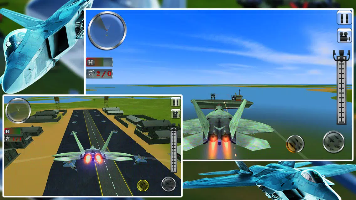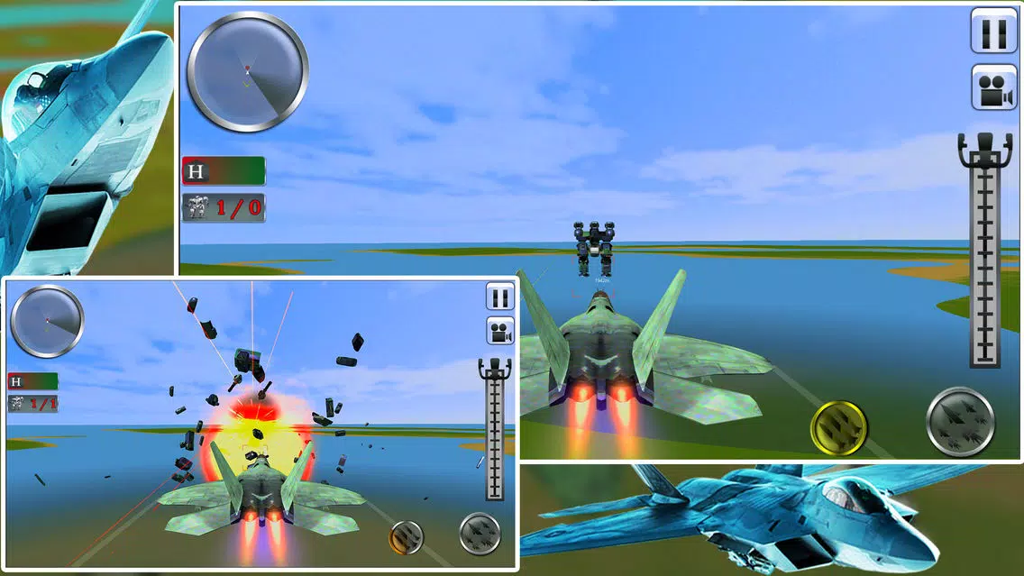 Jet fighters are made for air-to-air fighting combat with enemies aircraft. Some jets have properties to attack ground and some have to attack aircraft combat fighters. All the top features from all jet fighters like F15 Eagle, F16 Fighting Falcon, F17 Thunder, F18, F19 stealth fighter, F20 tiger shark, F21 forever are in one F22 Raptor Jet Air Fighter. You can easily enjoy all the fighting features in this raptor. Now F22 Raptor is under you and you have to fight against US army Robots to defend your frontline army airbase to defend your country. You must be aware this game is not an Air Jet fight transformation robot game, but you can still enjoy your time to play as a Jet Fighter Pilot. You have to fight against robots warships, static steel fighters robots, and flying steel futuristic robots. Robo warships are fully equipped with multilevel warfighting robot. I know you got bored from simple jet simulation games or simple jet fighting games or simple jet transforming simulation games, but this game is different one you can enjoy real feel of a jet pilot. US army robots are the army superhero warrior robots, now it's an open challenge for you to prove them false, complete your challenge and prove them wrong.